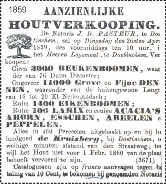 TEKST UIT ONDERSTAAND BERICHT: Uit de hand te koop een welgelegen plaisierige Buitenplaats, genaamt den KRUISBERG, anderhalf uur van Doesburg, een klein half uur van Deuticum in de Graafschap Zutphen, bestaande in een modern Heeren huis, Stallingen, Koetshuis, Tuinmans Wooning, een cierlyke spatiuese Bloemhof, daar in Pedestallen en Beelden, Moestuinen en Boomgaarden, alle by den anderen aan en by het Huis in zyn Grachten gelegen, benevens twee annexe Boere Wooningen, met onderhoorige Bouw- en Weylanden, Akkermaals Bossen, verscheide reguliere Allées, Sternbos, Bossen van Eike, Beuke en Denne opgaande Boomen, twee Tenten en vier groote Visvyvers, alle by den anderen in den KRUISBERG gelegen, en te zien in de aanstaande maanden Juny, July en Augusty; de nadere onderrichting en aanwyzing zal door den Hovenier op den plaats gedaan worden.